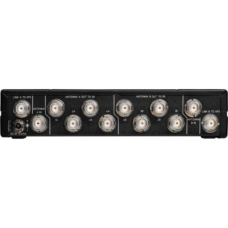 Cihazın arkasında, yol başına üç adede kadar aktif kablosuz sistem elemanına güç sağlamak için 10 VDC sağlayan iki anten girişi bulacaksınız. Böylece, bir RF yolu aktif bir antene ve iki anten güçlendiricisine güç sağlayabilir. Ayrıca, dörde kadar çeşitlilik alıcısını beslemek için iki set dört BNC anten çıkış bağlantısı ve toplamda üç APS4'e kadar basamaklı bağlantı için iki anten çıkışı bulacaksınız.