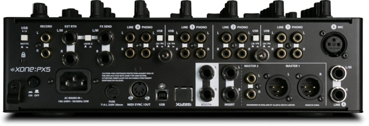 XONE:PX5'in üzerinde ana çıkışlar, kulaklık çıkışı, mikrofon girişi ve RCA giriş/çıkışları gibi bağlantı noktaları da bulunur. Bu sayede mikseri hoparlörlere veya ses sistemine bağlayabilir, mikrofon kullanabilir ve ek harici ekipmanları entegre edebilirsiniz.