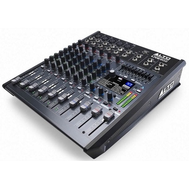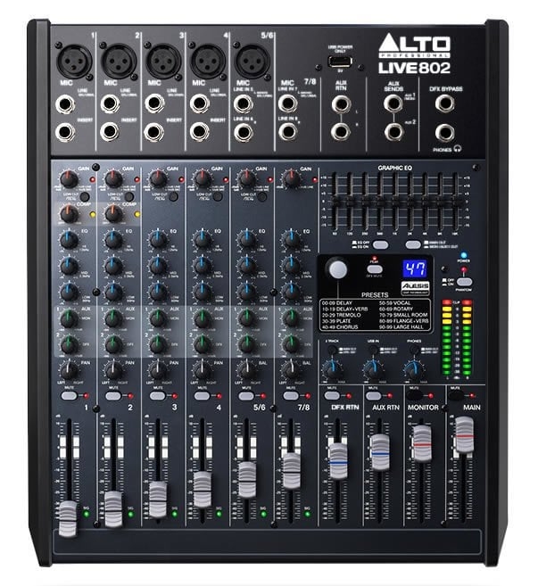 Alto'nun DSP ve USB'li Live 802 8-Kanal/2-Bus Mikseri, esnek yönlendirme seçenekleri ve yerleşik DSP araçlarıyla donatılmış profesyonel bir 8 kanallı, 2 veriyolu mikseridir. Değiştirilebilir fantom gücüne sahip 5 dengeli XLR girişi, ek ton şekillendirme için 3 bantlı EQ'lar, harici efektler ve izleme için kanal başına iki aux gönderimi ve ana veya monitör çıkışları için 9 bantlı bir grafik EQ'ya sahiptir. Bağımsız seviye kontrolüne sahip bir kulaklık jakı, ek izleme ve miksaj sağlar. Live 802, LED metreli 60 mm fader'lara sahiptir ve doğru, uygulamalı miksaj için hassas kontrol ve görsel geri bildirim sağlamak üzere tasarlanmıştır.