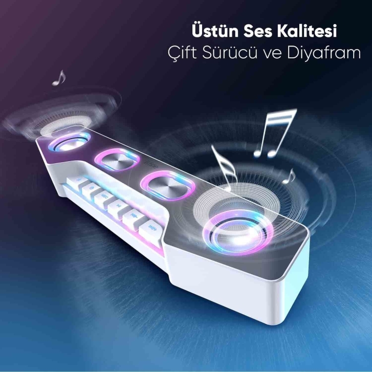 • Kontroller: Ses kontrolü, RGB ışık modları, oyun modu (ses etkileri), Bluetooth eşleştirme düğmesi ve güç düğmesi