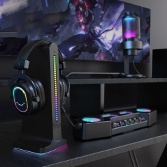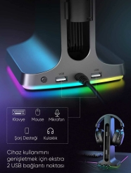 • USB hub: Kulaklık standı, bilgisayarınıza bağlanan bir USB hub işlevi görür. Bu sayede, kulaklık standı, bilgisayarınızdaki USB portlarının çoğunu serbest bırakabilir ve diğer cihazlarınızı kolayca bağlayabilirsiniz.