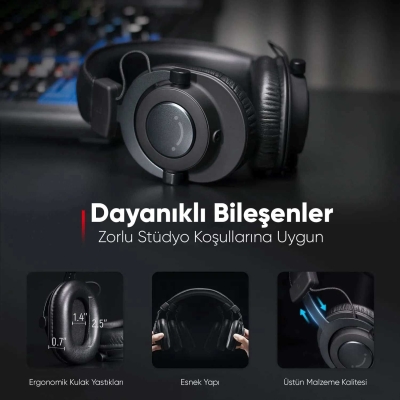 Arkası kapalı (closed-back) tasarımı ve suni deri ile kaplanmış yoğun kulak pedleri sayesinde Fifine H8, dış ortam seslerini etkili bir şekilde izole eder. Bu, özellikle vokal kaydı yaparken mikrofonunuza kulaklıktan ses sızmasını engeller ve miks yaparken en ince ayrıntılara bile tam olarak odaklanmanızı sağlar.