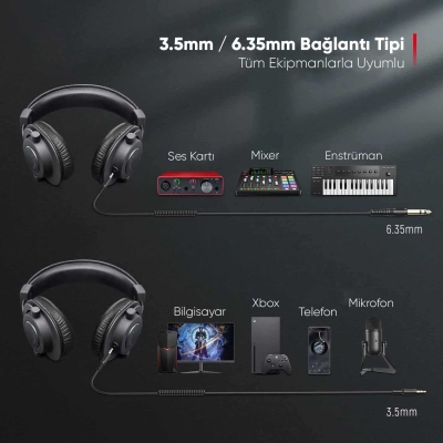 32 Ohm'luk düşük empedansı sayesinde Fifine H8, özel bir kulaklık amfisine ihtiyaç duymadan her cihazla en iyi performansı sunar. Kutu içeriğindeki 3 metrelik uzun kablo ve 3.5mm'den 6.35mm'ye dönüştürücü adaptör ile uyumluluk sorunu yaşamazsınız:
