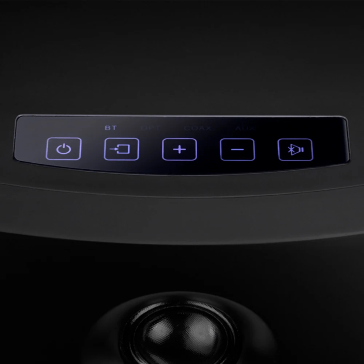 Ana hoparlörün üst panelinde yer alan dokunmatik kontrollerle giriş kaynakları, ses seviyesi ve sessize alma gibi fonksiyonlara kolayca erişin. Kutu içeriğindeki tam özellikli kızılötesi uzaktan kumanda ise, tüm bu kontrollere oturduğunuz yerden erişmenizi sağlar.