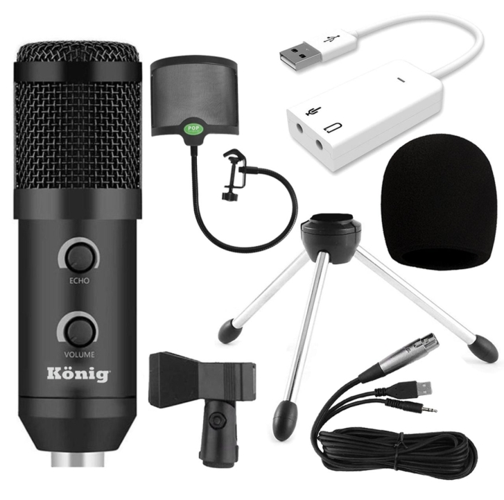 König K-CM 300 Condenser Mikrofon + Metal Pop Filtre + 7.1 Ses Kartı + Tripod Sehpa Paketi Kutuİçeriği