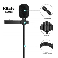 König K-YM3, çok yönlü yaka mikrofonu modelidir. Telefon, bilgisayar, kamera, fotoğraf makinesi, ses kayıt cihazları, tablet, Ipad, amfi, mikser ve benzeri akıllı cihazlarda çalışabilen yaka mikrofonu modelidir. Standart 3.5 mm jack girişine sahip olan König KYM3, aynı zamanda 6.3 mm çevirici adaptörü ile birlikte gelmektedir.6 metre kablo uzunluğuna sahip olan bu ürün hassas ses kalitesi ile çalışmaktadır.