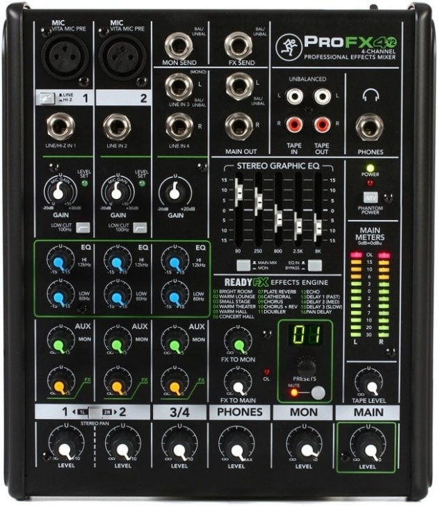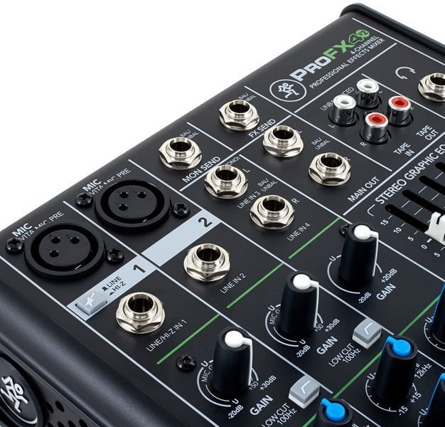ProFXv2 mikserleri, eşsiz ses kalitesi için yepyeni Vita ™ ön amplifikatörlerine ve yepyeni, son derece güçlü ReadyFX ™ efekt motorunu içeren bir canlı karıştırma araç setine sahiptir.Profx4v2 mikser modeli ise bu serinin 4 kanallı modelidir. Mackie ProFX4v2 mikserler, her biri eşsiz performans sağlayan geniş bir model yelpazesi ile kapsamlı bir canlı ses çözümü sunar.Tamamen yeni ön amplifikatörler ve efekt motorları ile birlikte GEQ ve USB kayıt / oynatma gibi araçlarla ProFX4v2 mikser performansı canlı ses deneyiminizi gerçekten yükseltir. Özel olarak canlı ses için tasarlanan Vita preamp'lar, benzersiz bir A sınıfı ön uç tasarımı, çift geri besleme stabilizasyonu ve eşsiz düşük gürültü performansı için yanlı akım optimizasyonu özelliğine sahiptir.