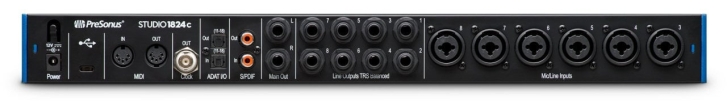 Studio serisinin en üst modeli olan Studio 1824c USB-C™ ses kartı 24-bit/192 kHz'de aynı anda 18 kanal'dan kayıt alabilir. Bu özelliği ile çok kanallı kayıt yapmak isteyenler için ideal bir çözüm sunmaktadır. Üzerinde 8 adet XMAX Class A mikrofon preamplifikatörü, ADAT ve S/PDIF giriş/çıkış bulunmaktadır. 18 adet çıkışı Studio One artist (PC Mac) ve UC Surface Pro (Mac, Windows, iPad, Android) yazılımları ile 0 gecikmeli DSP-tabanlı son derece esnek monitor miks imkanı sunmaktadır. Mute ve mono düğmeleri ne sahip olan ana çıkışların yanında DC Coupled olarak çalışan sekiz line seviyesinde çıkış, bağımsız iki ayrı kulaklık çıkış, word clock çıkış ve MIDI giriş/çıkış bulunmaktadır.