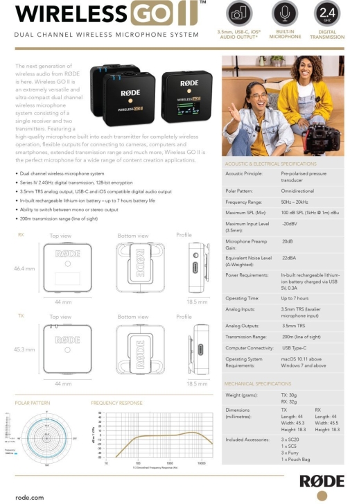 Dünyanın en küçük ve gerçek telsiz mikrofon sistemi yeniden doğdu. Wireless GO II sistemi iki verici ve bir alıcıdan oluşan son derece kullanışlı, ultra kompakt bir telsiz mikrofon sistemidir. Orijinal Wireless GO'da bulunan profesyonel ses kalitesine, benzersiz form faktöre ve patentli teknolojiye sahip olan Wireless GO II çok çeşitli içerik üretme uygulamaları için idealdir.