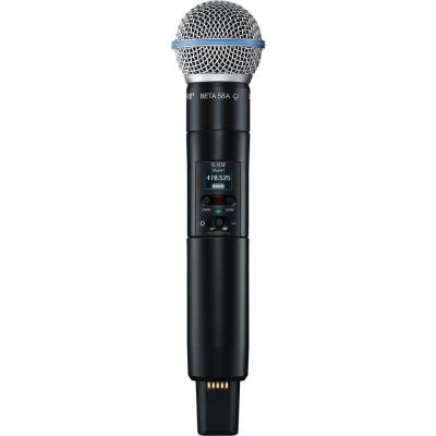 Shure SLXD2 / B58A, SLX-D alıcılarla uyumlu bir dijital el tipi kablosuz mikrofon vericisidir. Yakın çekim vokalleri için tasarlanmış bir Beta 58A dinamik kapsül, yakınlık efektini kontrol etmek için parlak orta kademe ve bas azaltma ile donatılmıştır. Kapsül, geribildirimden önce yüksek kazanç, diğer ses kaynaklarından maksimum izolasyon ve minimum eksen dışı ton renklendirmesi sağlayan süperkardioid bir polar modele sahiptir.