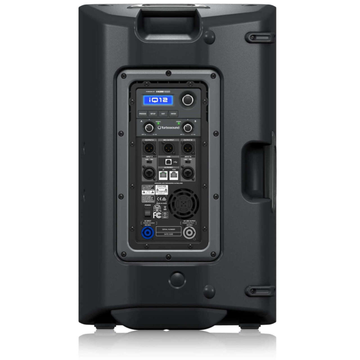Arka panel amplifikatör modülünde, bir LCD ekran, Kanal A ve B kazanç kontrolleri ve seviye, EQ, Hoparlör modelleme, SCC, Subwoofer Entegrasyonuna sezgisel erişim için tek bir döner kodlayıcıdan oluşan tam özellikli bir kullanıcı arayüzü bulacaksınız. Geri Bildirim Kontrolü (FBI). İki kombinasyon dengeli XLR / jak girişine, iki bağımsız kanalın her biri için dengeli XLR çıkışlarına ve bir Mix Out XLR konektörüne ek olarak, iQ12 bir mikrofon / hat anahtarı ve her kanalda sinyal mevcut LED ile seviye kontrolü içerir.