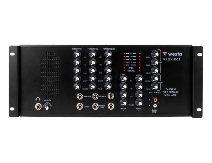 Gelince Haber VerWesta WS-EZN-800-E, daha büyük camiler, daha geniş alanlar ve daha fazla hoparlör gerektiren sistemler için tasarlanmış, yüksek güçlü bir ezan ve anons amfisidir. 800 Watt'lık gücüyle, 8 adede kadar ünite (horn) hoparlörü rahatlıkla besler ve sesinizin her noktaya net bir şekilde ulaşmasını sağlar.