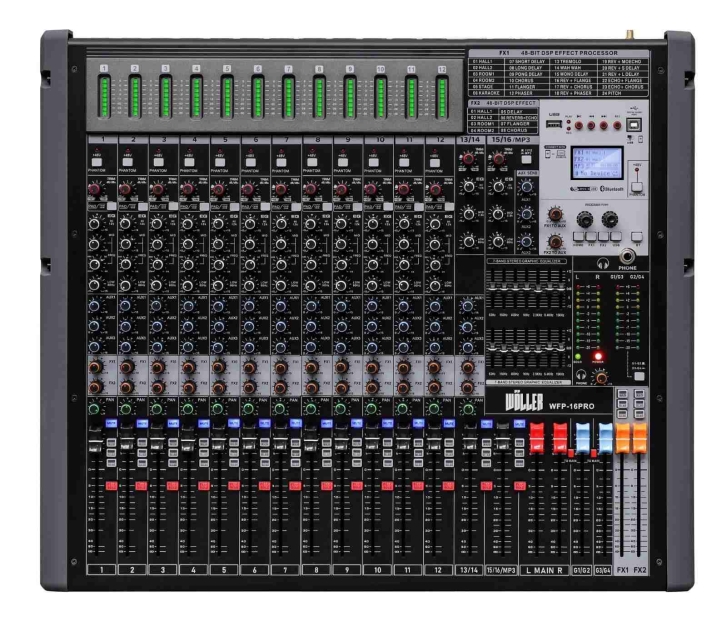 16 Kanal Power Mikser12 Mono 2 Stereo Giriş2x1500 Watt Max. Çıkış Gücü3 Aux4’lü TonlamaDouble Dsp EfektUSB KayıtBluetooth ve Usb Destekli+48V Phantom Her Kanal için2x7 Band EkolayzerTüm Auxlara Effect Gönderme